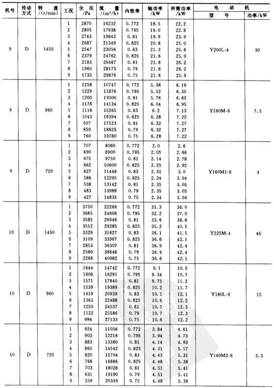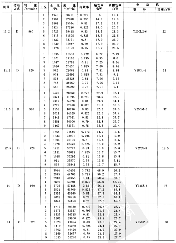 1)本風(fēng)機為單吸入風(fēng)機,機號有No.3.15、3.55、4、4.5、5、5.6、6.3、7.1、8、9、10、11.2、12.5、14等共14個機號組成。