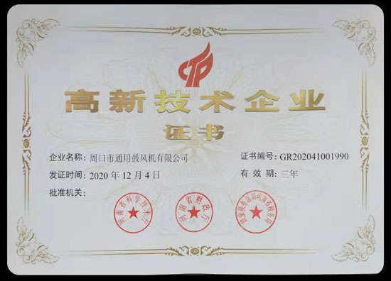 2020年12月4日,經(jīng)國(guó)家稅務(wù)總局河南省稅務(wù)局、河南省財(cái)政廳、河南省科學(xué)技術(shù)廳認(rèn)真評(píng)審,周口市通用鼓風(fēng)機(jī)有限公司順利榮獲“高新技術(shù)企業(yè)”證書(shū)。這是政府及社會(huì)各界對(duì)公司的認(rèn)可,我們將以此為動(dòng)力,努力的打造"周口風(fēng)機(jī)”品牌,生產(chǎn)出更好的產(chǎn)品來(lái)回饋客戶!